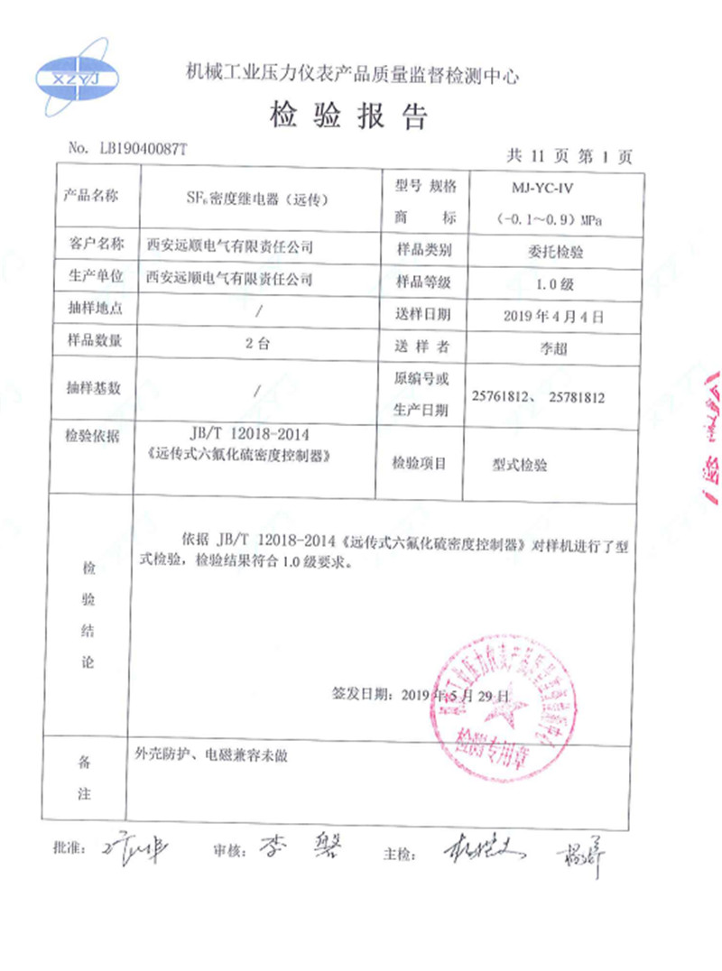 远传SF6密度继电器 型式试验报告1.0级 LB19040087T