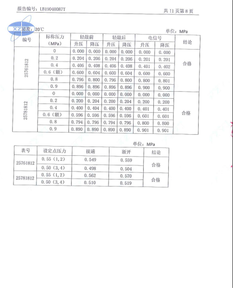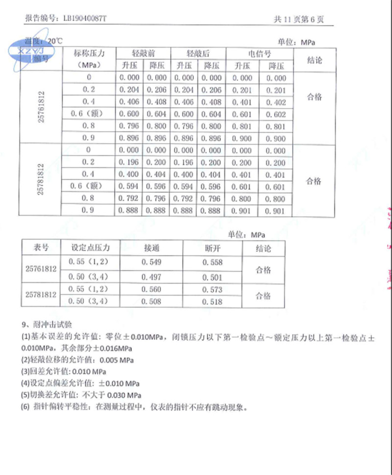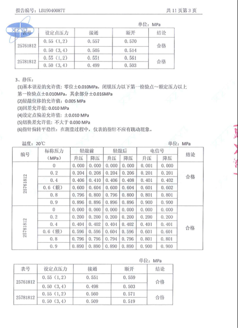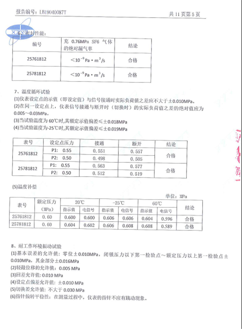 SF6密度继电器 型式试验报告1.0级 LB19040086T