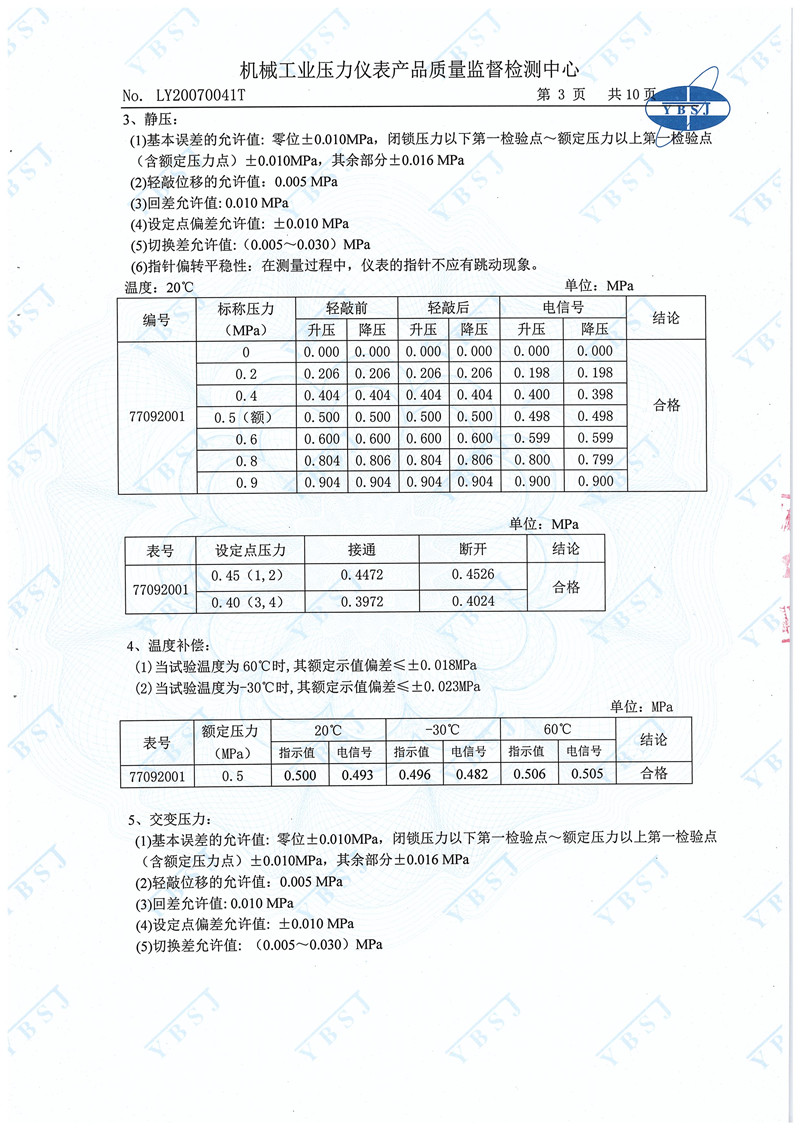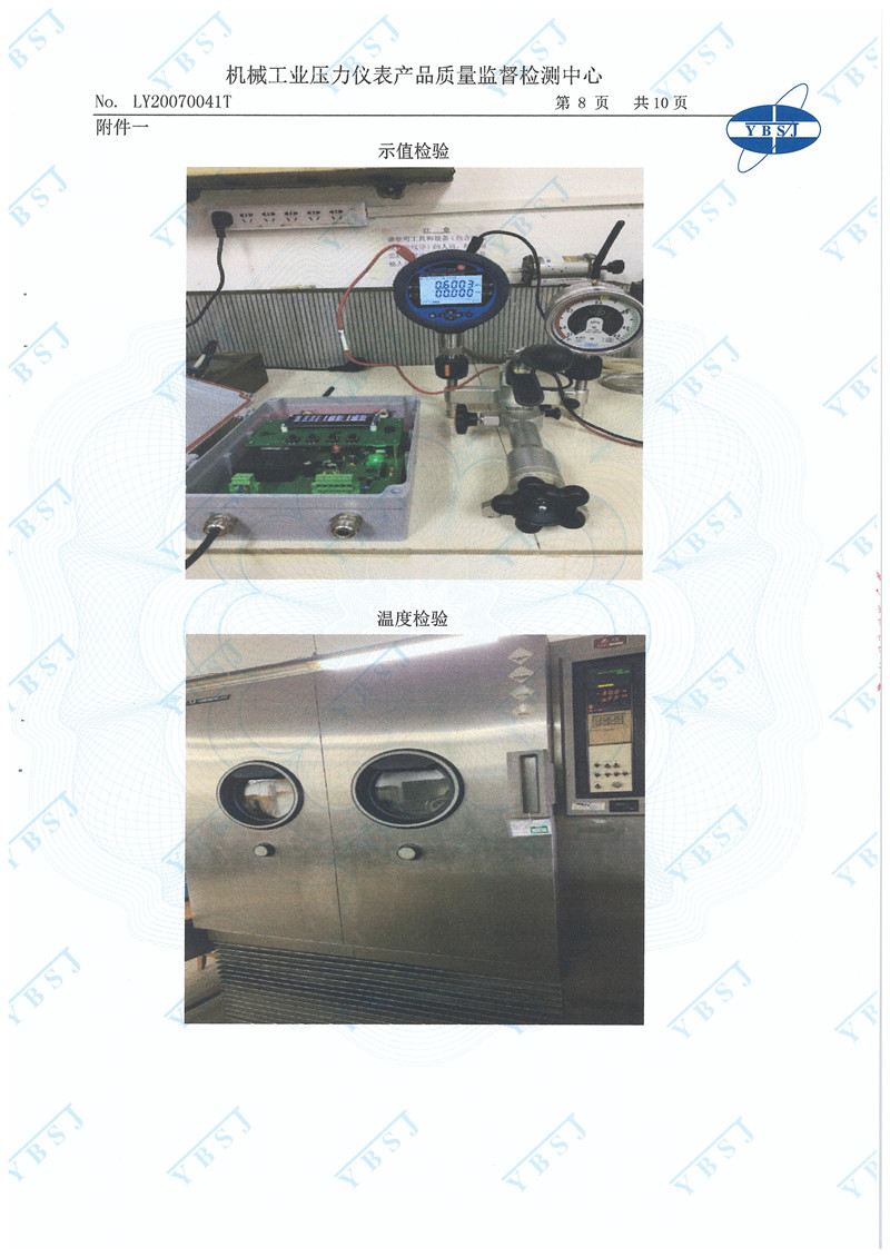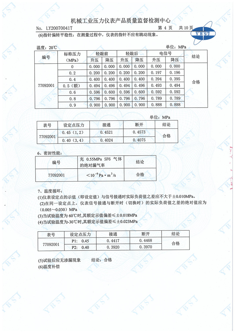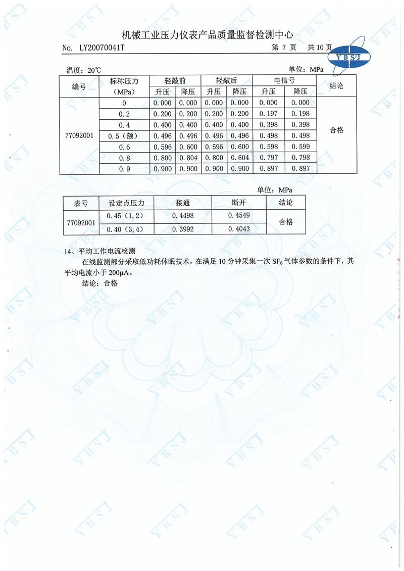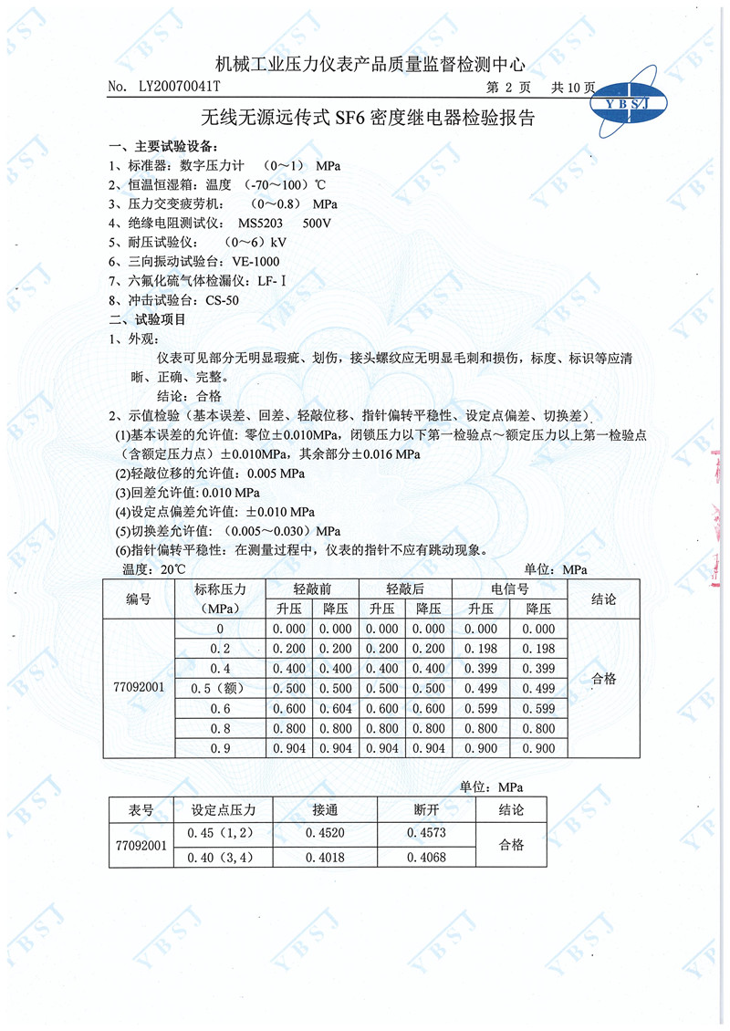 > 无线无源 远传式SF6密度继电器检验报告1.0级 LY20070041T